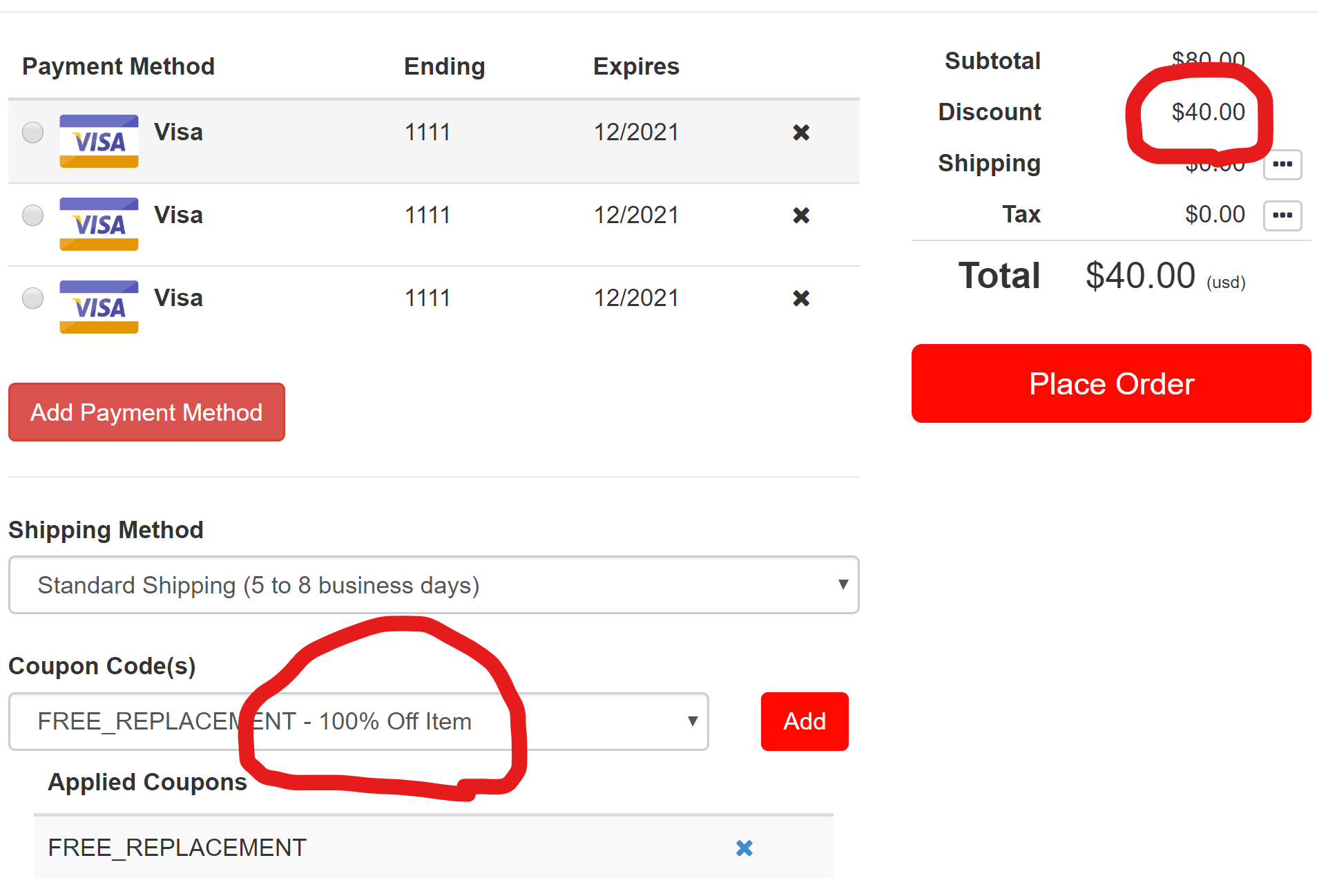 I'm wondering, could you create a coupon code for 100% off, that could be applied in the order created by the call center agent in Disco? I'm just thinking of any way we could create a clear accounting for the full discount... in the case below, I created a 100% off coupon for a particular $40 item, of which there were two in the cart. When I applied the coupon, it did take 100% off one of the items.