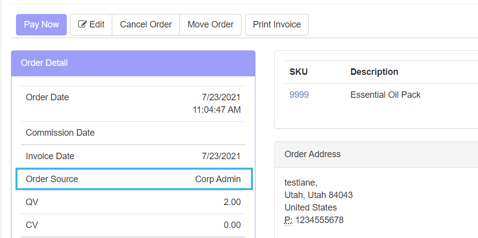 Corporate Admin > Order Detail.