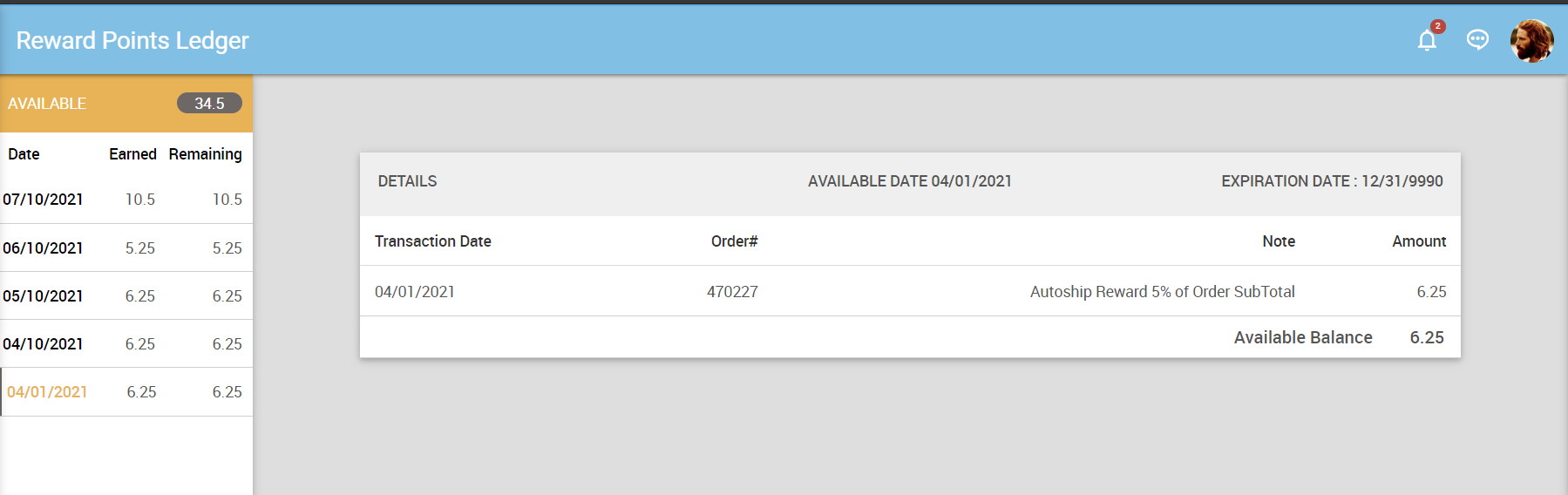 Reward Points Ledger page
