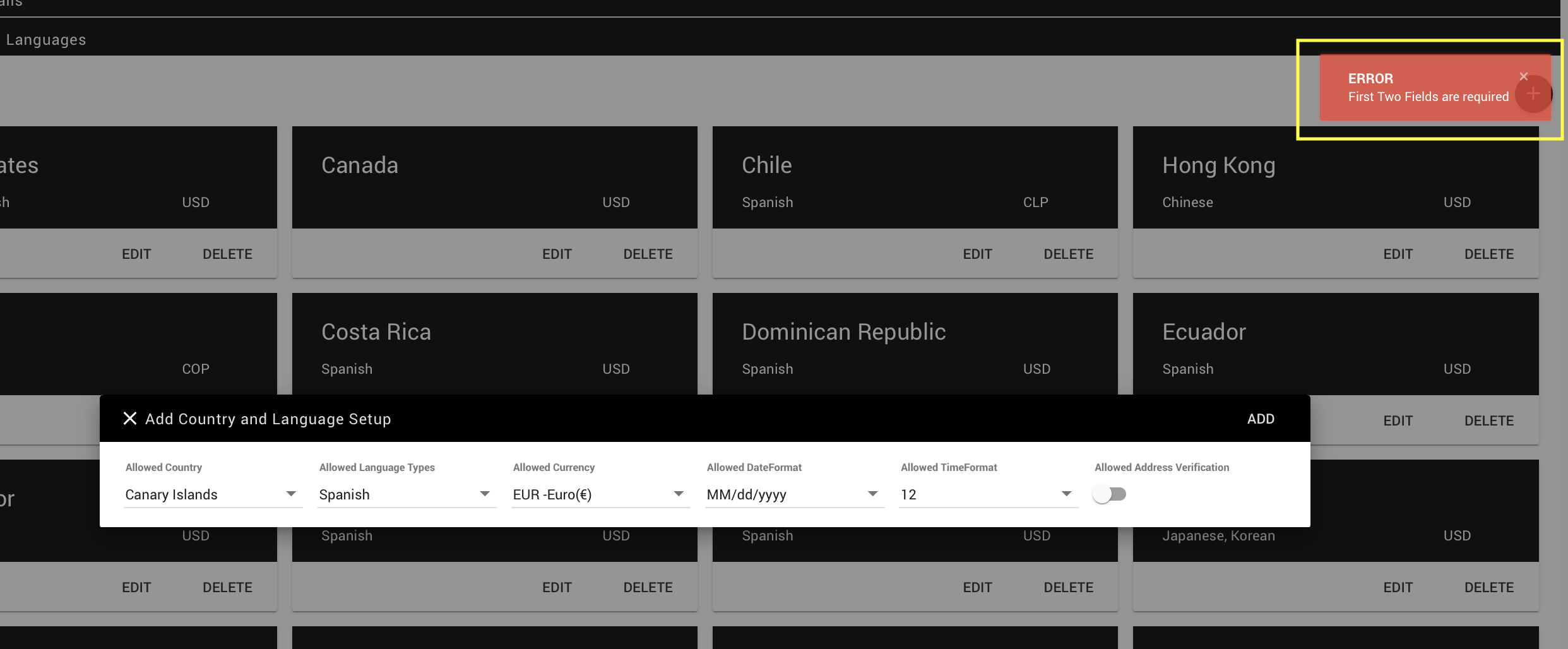 We’ve fixed a bug that prevented some clients from adding countries. When attempting to add a country in Web Office Admin Live and Stage, users were getting the following error: First Two Fields are required., even though all the required fields were filled.